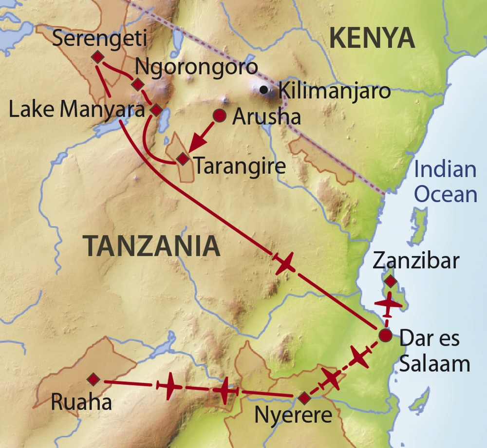 Ab Arusha fahren Sie durch die typische Steppenlandschaft und an Masai-Dörfern vorbei in den Tarangire Nationalpark. Der Park hält neben den majestätischen Baobab-Bäumen eine enorme Vielfalt der Tier und Pflanzenwelt bereit. Besonders beeindruckend ist die grosse Anzahl an Elefanten.