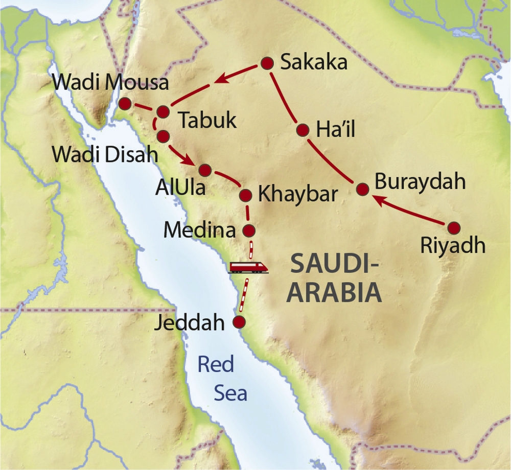 Zuerst Besichtigung der nahe gelegenen Rajajil-Säulen. Weiterfahrt über Dumah Al Jandal sowie Al Qaliba bis nach Tabuk. Übernachtung in Tabuk.