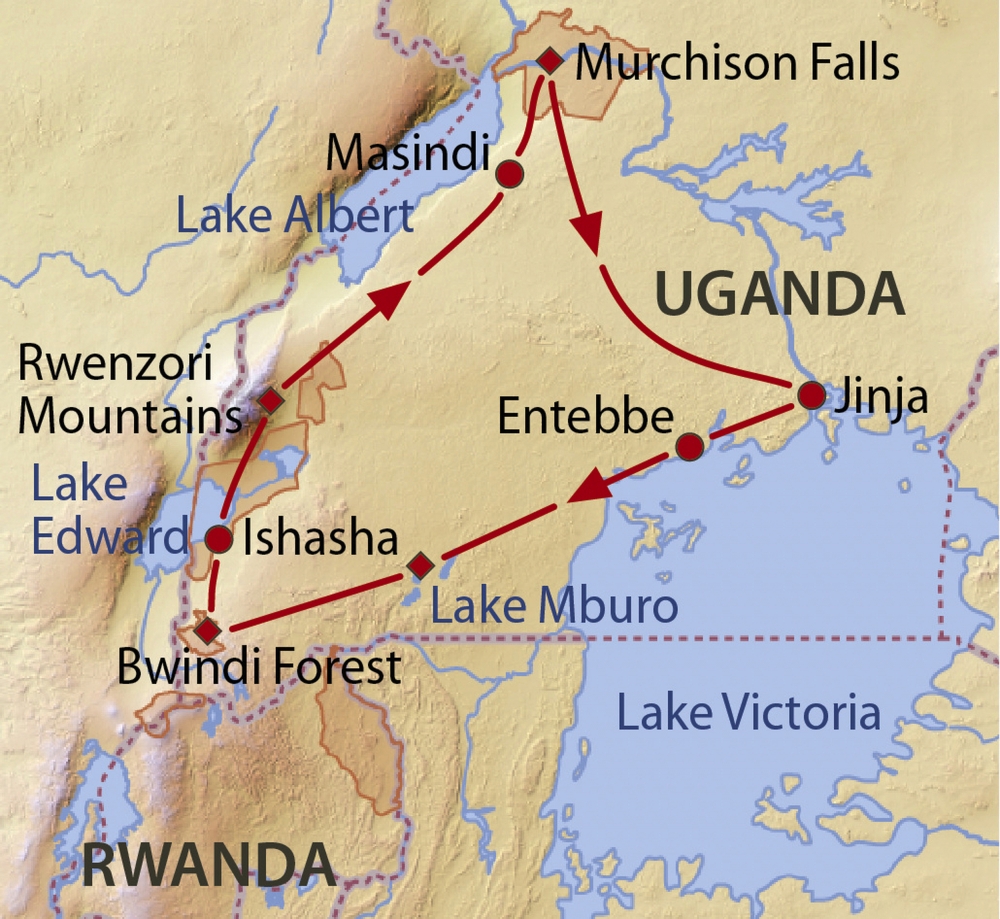 Im Murchison Falls Nationalpark stehen folgende Aktivitäten auf dem Programm. Schimpansen-Tracking, Pirschfahrt, Besichtigung der Murchison-Wasserfälle und eine Bootsfahrt auf dem Nil.