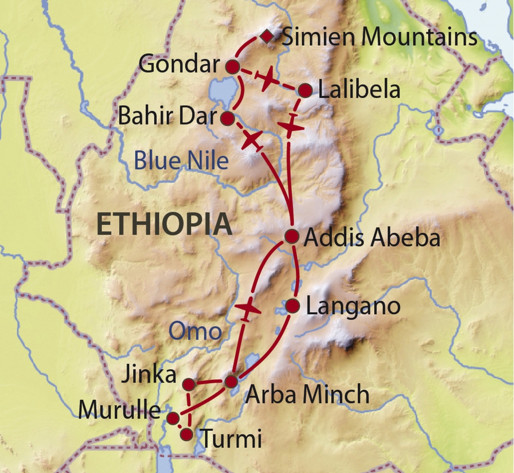 Fahrt nach Arba Minch und Flug zurück nach Addis Abeba. Abendessen in einem lokalen Restaurant und Transfer zum Flughafen.