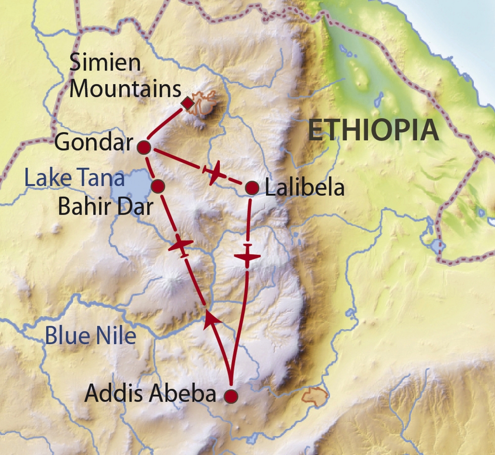 Flug zur Stadt Bahir Dar, die direkt am Ufer des Lake Tana liegt. Besichtigungen der Wasserfälle des Blauen Nils sowie der Inselklöster.
