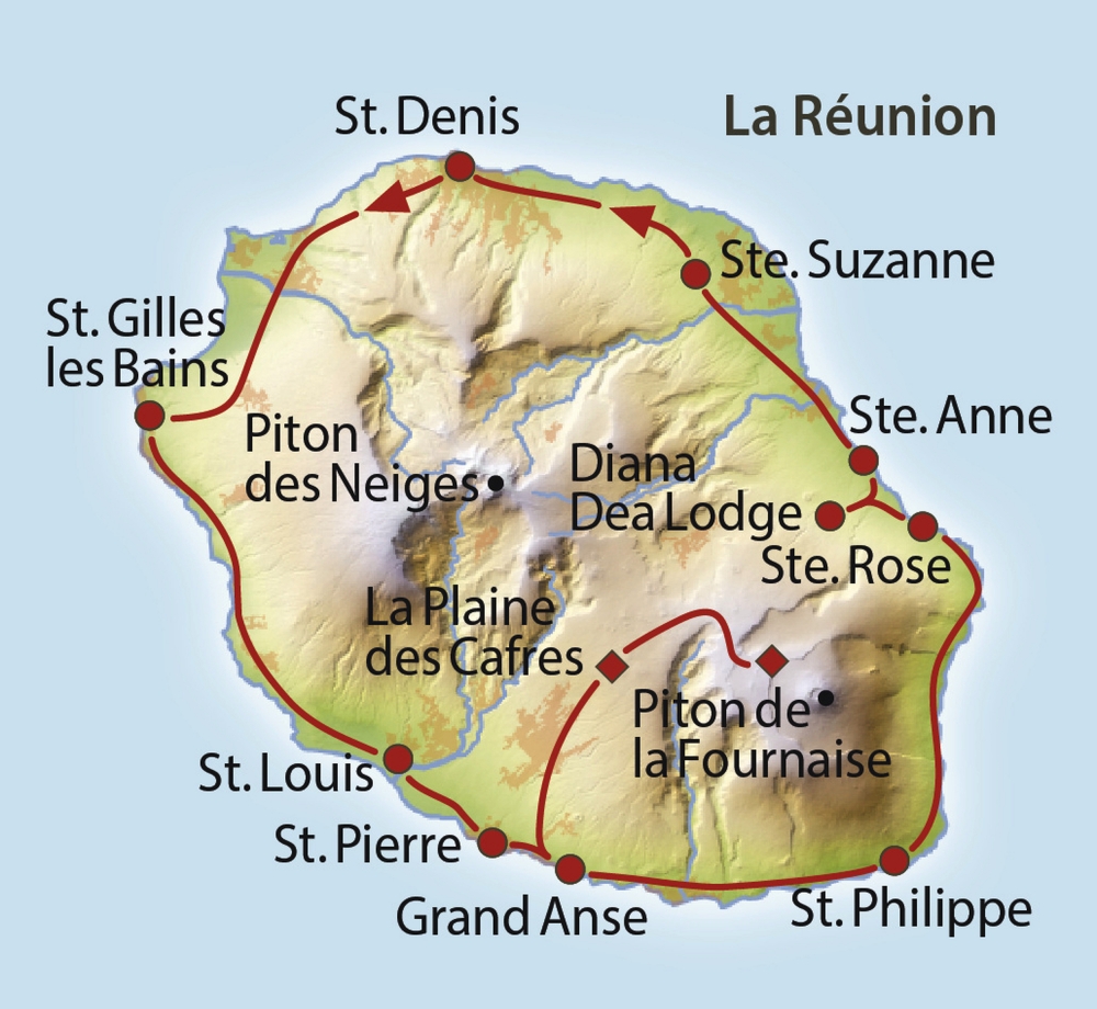 Übernahme des Mietwagens am Flughafen und Fahrt der Westküste entlang bis nach St. Gilles. Übernachtung / Frühstück Hotel Le Saint Alexis.