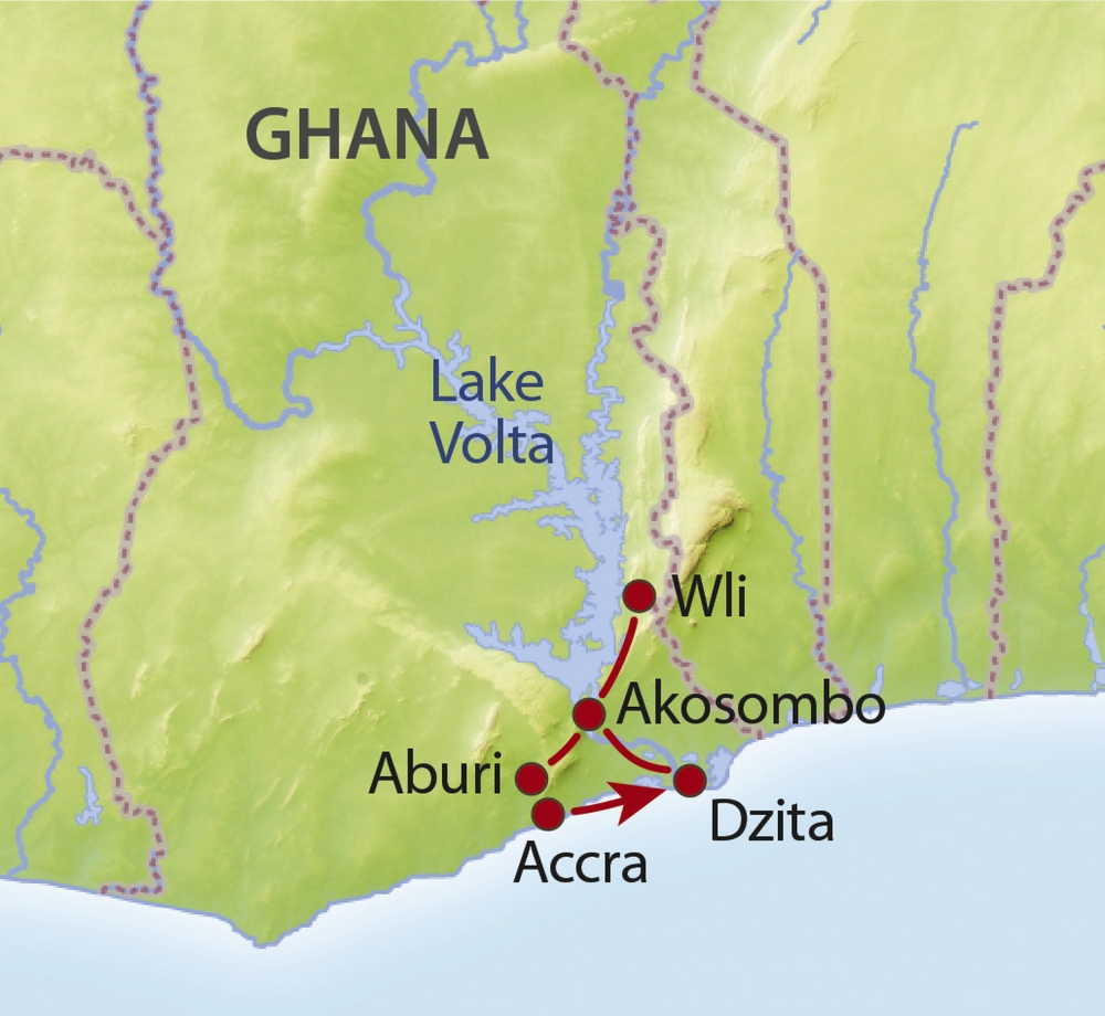 Heute steht das Tafi Monkey Sanctuary auf dem Programm, ein Ort, an dem die heiligen Mona-Affen seit Jahrhunderten in Harmonie mit der lokalen Bevölkerung leben. Am Nachmittag geht es weiter zu den Wli-Wasserfällen, die als die höchsten in Westafrika gelten. Möglichkeit zum Schwimmen.