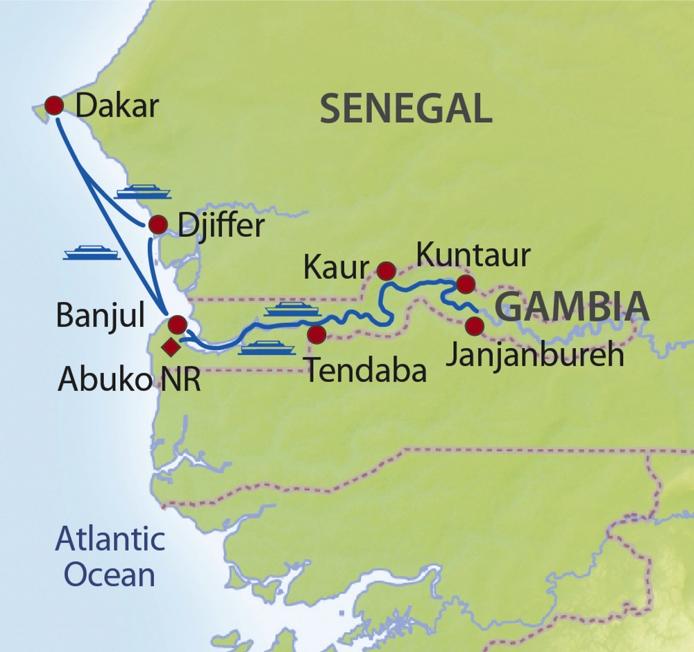 Landausflug auf die St. James Insel, UNESCO-Weltkulturerbe und wichtiger Sklavenhandelsposten unter der britischen Herrschaft. Am Abend Fahrt Richtung Dakar inklusive traditioneller Abendunterhaltung.