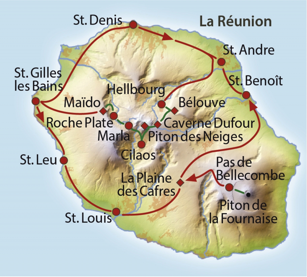 Wanderung Roche Plate bis nach Maido. Dauer ca. 4½ bis 5 Stunden, Länge: 7,5 km, Höhendifferenz: + 1000 m. Am Ende des Mafate Wanderweges Transfer zurück nach St. Gilles. Übernachtung / Frühstück im Hotel Alamanda.