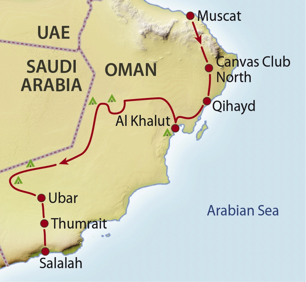 Fahrt von Muscat aus durch eine wechselnde Landschaft bis in die Wahiba Sands Wüste. Übernachtung im exklusiven Canvas Club North Camp inmitten der atemberaubenden Wüstenlandschaft.