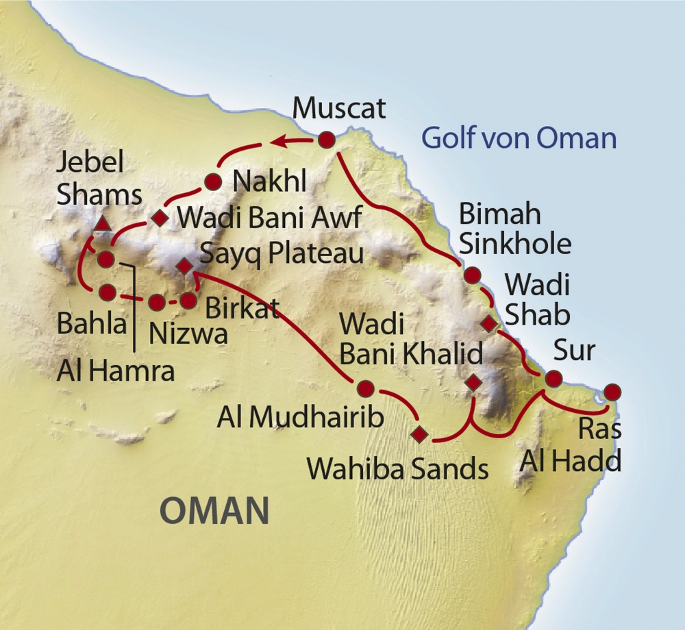 Vormittags Stadtrundfahrt Muscat und nach dem Besuch des Muttrah Souq steht die erste Wanderung auf dem Programm. Übernachtung in Muscat.