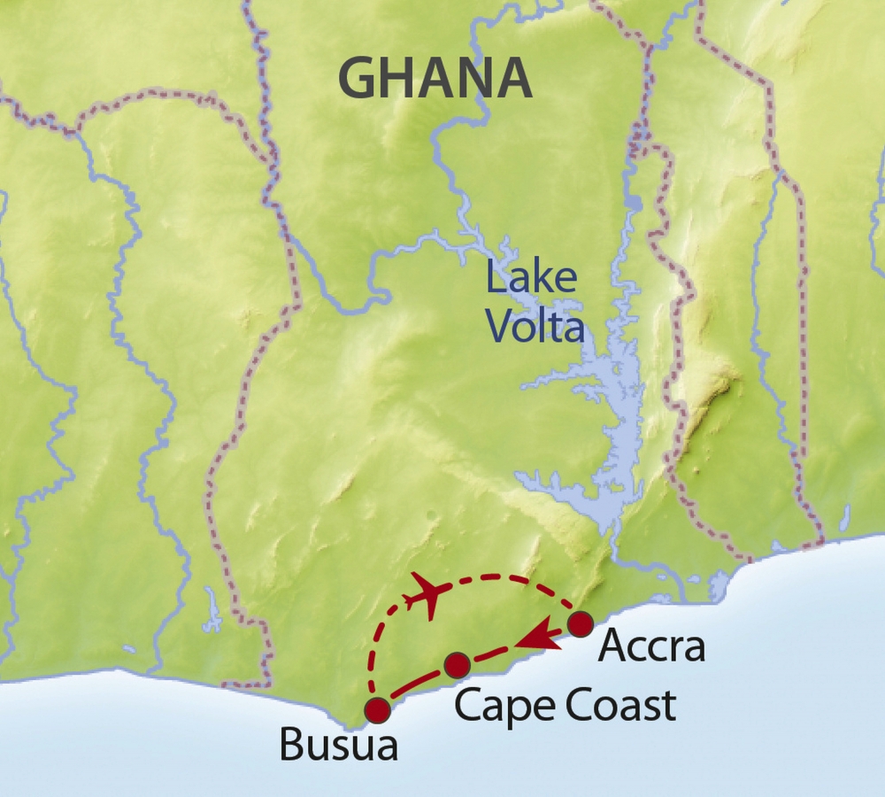 Sie besuchen das Cape Three Points, wo es ein Fischerdorf, einen historischen Leuchtturm, ein Naturschutzgebiet an der Küste und schöne Strände zu sehen gibt. Fahrt nach Takoradi und Inlandflug zurück nach Accra.